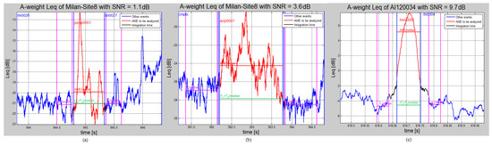 Subsequently, the labelled audio clips were exported as independent ‘.wav’ audio files using a sampling rate of 48 KHz and 16 bits/sample. Each filename contained the following parts: type of sensor, type of event, order of appearance of this type of event in the same audio project, direction of measurement in relation with the traffic direction, elevation angle of the measurements, type of road and traffic density. Subsequently, the ANE audio chunks were also tagged in terms of SNR in dB, that is computing the relative amount of ANE amplitude with respect to the BCK or RTN noise. After a preliminary attempt to compute this calculation manually, we opted to develop a semiautomatic SNR labelling approach, which is explained in Section 3.3.