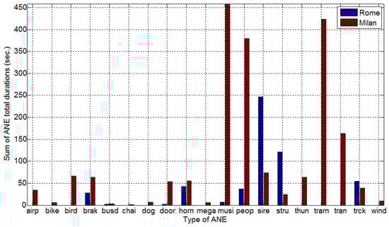 Histograms showing the accumulated ANE durations per category differentiating both locations Rome (suburban) and Milan (urban). The x-axis show the ANE category.