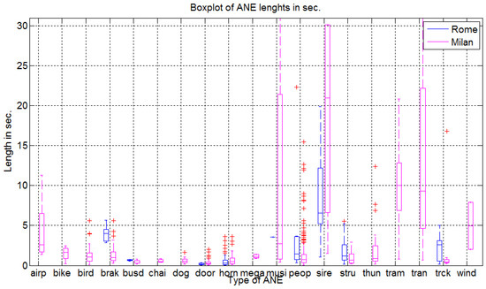 In this section, we analyze the durations of the ANE subcategories for each of the two recording scenarios. In Figure 9 the boxplots of ANE durations are shown for each ANE subcategory. As it can be observed, in the suburban context the sounds of sirens constitute the longest ANEs, while the shortest ones are impulsive-like noises (labelled as ‘door’) in the A90 highway ring circumventing Rome. However, in these recordings brake noises, people, sounds of trucks and noise coming from the structure of portals also have significant durations.