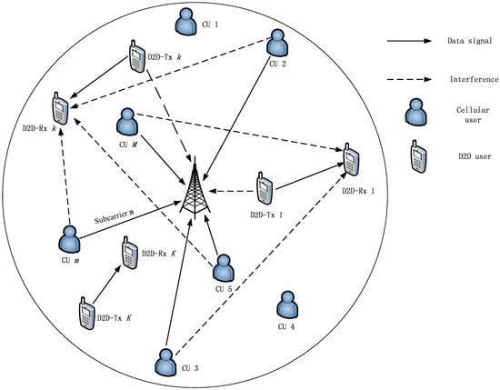 Device-to-device (D2D) communication has been proposed as an underlay to cellular networks where user equipments (UEs) in proximity are able to communicate directly with one another with the support of evolved node B (eNB) [1,2]. D2D communication pairs bring a large amount of benefits for users, such as expanding the service coverage area, increasing data rate, improving system energy efficiency, enhancing network throughput, reducing network delay, creating new types of services, and so on [3,4]. Additionally, the spectral efficiency could be further improved by allowing D2D users (DUs) to share the same spectrum resources with cellular users (CUs). In this case, intra-cell interference between DUs and CUs is no longer negligible so that a proper radio resource allocation strategy is needed to obtain the potential performance gains.