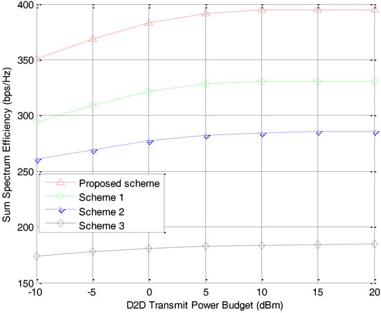The sum spectrum efficiency of the heterogeneous network with different D2D transmit power budget is illustrated in Figure 4, where , , m, and bps/Hz. Intuitively, the sum spectrum efficiency rises with the increase of D2D transmit power budget. Since the total power can be allocated to multiple subcarriers of multiple D2D pairs, our proposed sharing scheme exhibits the best performance and the largest increases in sum spectrum efficiency. In addition, the sum spectrum efficiency increases rapidly in the lower D2D transmission power case. When dBm, the growth curve becomes smooth, which implies that the sum spectrum efficiency starts to saturate and the D2D transmit power does not have a major impact on the performance improvement. Figure 5 shows the sum spectrum efficiency with different rate requirement of the CUs, where , , m, and dBm. Similarly, it is obvious that the proposed scheme performs much better than the other three. Moreover, with the increasing rate requirements of CUs, the sum spectrum efficiency of the heterogeneous network decreases slightly. With higher rate requirements, more transmission powers for CUs are needed to meet the required QoS, and thus more D2D pairs that share the same subcarriers with these CUs are restricted, resulting in that only the D2D pairs which generate low interference to the eNB can reuse the subcarriers.