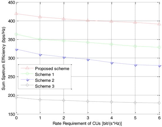 The sum spectrum efficiency versus the rate requirements of CUs.