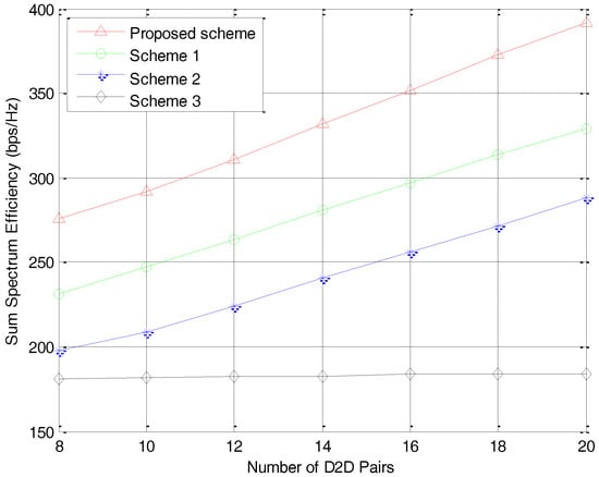 The sum spectrum efficiency versus the number of D2D pairs K.