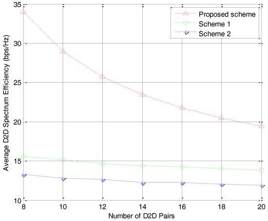 The average D2D spectrum efficiency versus the number of D2D pairs K.