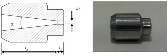 As a convergent nozzle is a typical rock erosion nozzle of wide application, this kind of nozzle was used to investigate the effects of a nano-silica additive on the rock erosion characteristics of a SC-CO2 jet. The structure of the convergent nozzle used in the experiments is shown in Figure 3. The exit diameter was d0 = 1 mm, the length of the exit was l1 = 2d0, the length of the conical section was l2 = 11d0, and the convergent angle was α = 13.5°.