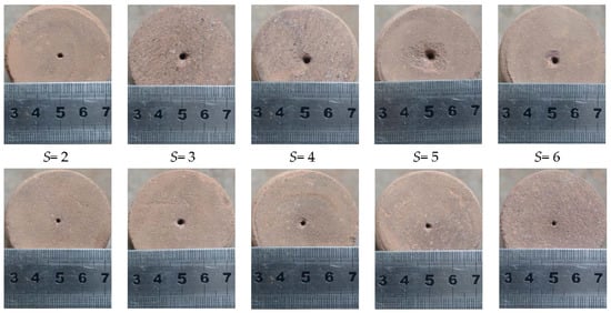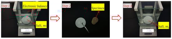 The rock erosion capacity of the SC-CO2 jet was evaluated by the erosion volume, V. The erosion volume was achieved in three steps, as shown in Figure 4. First, a certain amount of salt, which had a density of ρs = 2165 kg/m3, was measured using an electronic balance with a resolution of 0.001 g, and the mass was m1. Then, the erosion cavity was filled up with the salt, and the remaining salt was weighted on the balance, to record the mass, m2. Finally, the erosion volume was obtained using Equation (1). Each rock erosion experiment was repeated three times, and then the measured erosion volumes were averaged, in order to reduce the influence of accidental factors, making the results more reliable.