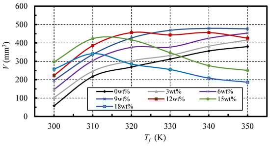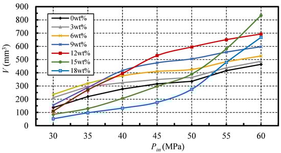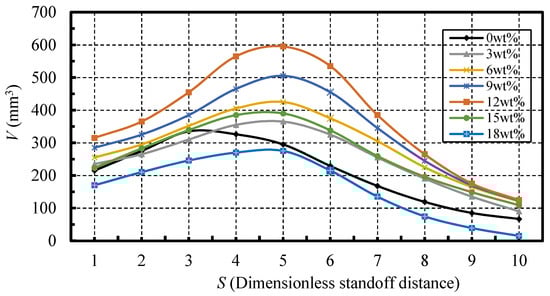 Furthermore, it can be observed in Figure 6 that, although the curves of the different mass fractions show a similar trend with an increase in the standoff distance, the jets with different mass fractions of nano-silica additive have different erosion capabilities at the same standoff distance. Specifically, the erosion volumes of the nano-silica SC-CO2 jets with a mass fraction of 3 wt %, 6 wt %, 9 wt %, and 12 wt %, are enhanced at all of the tested standoff distances. For mass fractions less than or equal to 12 wt %, an increase of the nano-silica mass fraction can increase the enhancement of the erosion capability. The maximum erosion volume is 595.13 mm3 with a mass fraction of 12 wt %, which is 1.8 times that of the pure SC-CO2 jet. For the mass fraction of 15 wt %, a reduction in the enhancement can be seen, when compared with that of 12 wt %. In terms of the mass fraction of 18 wt %, the erosion volumes of the nano-silica SC-CO2 jet are smaller than that of the pure jet, at most standoff distances. This indicates that the excessive addition of the nano-silica additive can attenuate the erosion capability enhancement generated by the nano-silica particles, and has an adverse effect on the erosion ability of the SC-CO2 jet.