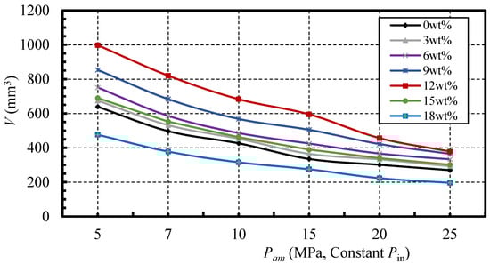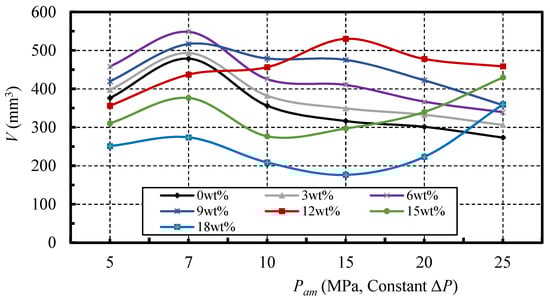 As is illustrated in the figure, it is obvious that the ambient pressure significantly affects the erosion ability, even though the ΔP value is constant. The curves increase at first and then decrease, for both the pure SC-CO2 jet and nano-silica SC-CO2 jet with a mass fraction of 3 wt %, which is much like that in the rock erosion experiment using the SC-CO2 jet, conducted by Wang et al. [22]. Additionally, the curves of the other nano-silica SC-CO2 jet show some deviations, which seems to be attributed to the erosion effect of the nano-silica particles in the jet flow. Moreover, when the ambient pressure is below the critical pressure of 7.38 MPa, the erosion volumes of all the jets show an increasing trend with the increase of ambient pressure, which is attributed to the increasing diffusivity and reducing viscosity of the CO2 fluid with increasing ambient pressure [27]. Moreover, the erosion ability of the jet with a comparatively low nano-silica mass fraction of 6 wt %, is the largest at ambient pressures of 5 MPa and 7 MPa. Then, with a further increase of the ambient pressure, the mass fraction of 9 wt % becomes the optimal condition, at an ambient pressure of 10 MPa, and the jet with a mass fraction of 12 wt % shows the best erosion performance, when compared to those with an ambient pressure of 15 MPa, 20 MPa, and 25 MPa. In addition, the further increase of ambient pressure can obviously enhance the erosion capabilities of the jets with mass fractions of 15 wt % and 18 wt %. These phenomena indicate that the optimum mass fraction shows an increasing trend with the increase of ambient pressure, under constant ΔP.