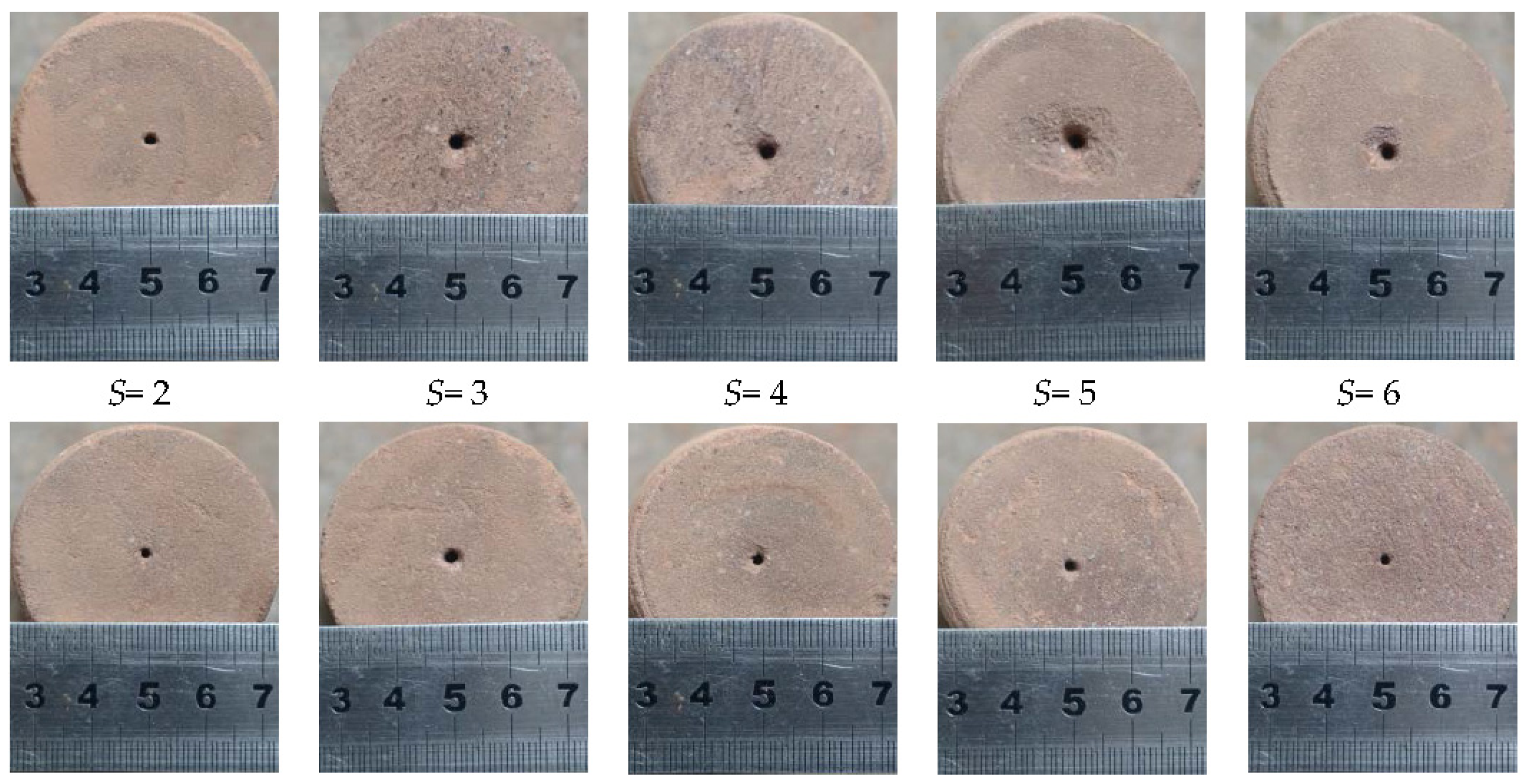 | Number | Length (mm) | Diameter (mm) | Density (g/cm3) | Compressive Strength (MPa) | Modulus of Elasticity (GPa) | Poisson’s Ratios |