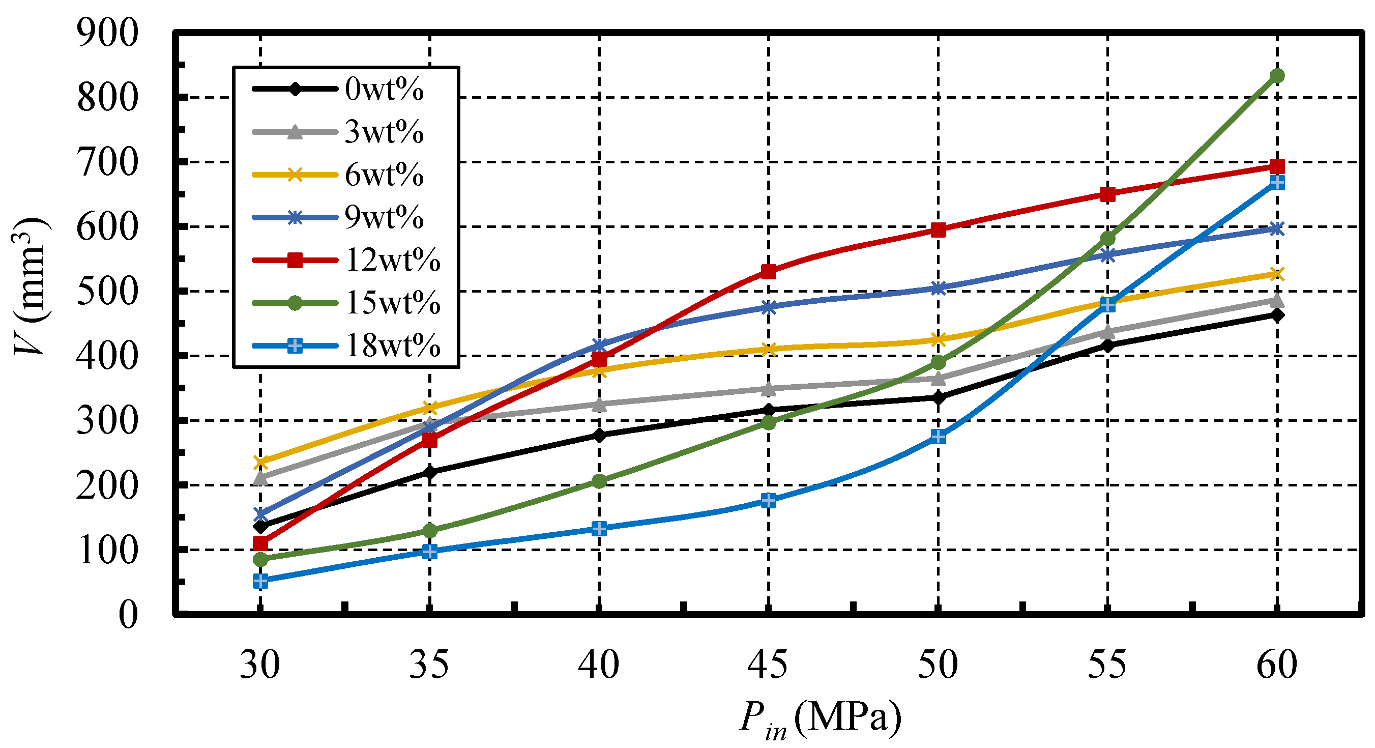 - The erosion abilities of all the jets show an increasing trend with the increase of inlet pressure. At the inlet pressures of 30 MPa and 35 MPa, a mass fraction of 6 wt % can achieve a better erosion ability than the others, while at an inlet pressure of 40 MPa, 9 wt % is the optimum mass fraction. Also, at inlet pressures of 45 MPa and 50 MPa, a mass fraction of 12 wt % is the optimum condition. In addition, when the inlet pressure is increased to 60 MPa, the jet with a mass fraction of 15 wt % has the best erosion ability.
