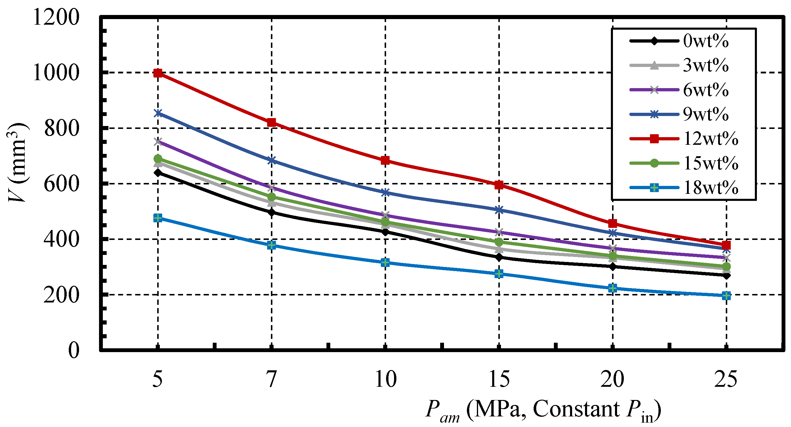 - Under the constant ΔP, the SC-CO2 jet with a nano-silica mass fraction of 6 wt % has the best erosion ability at ambient pressures of 5 MPa and 7 MPa. Then, with the increase of ambient pressure, mass fractions of 9 wt % and 12 wt %, take turns to achieve the best erosion ability. Moreover, a further increase of ambient pressure can enhance the erosion capability of the jets with mass fractions of 15 wt % and 18 wt %.
