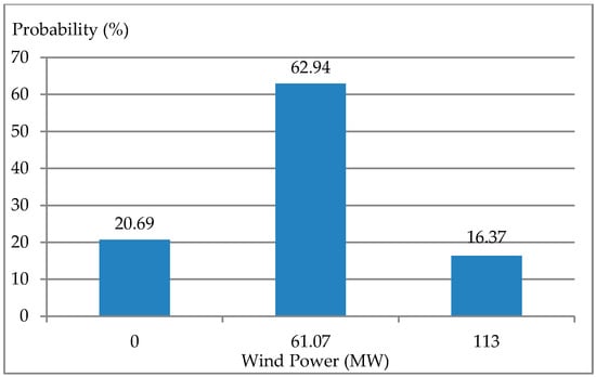 A ten-year daily wind speed data for the city of Madison, USA, was utilized to fit the Weibull distribution. Specifically, the rated power for wind generation was 113 MW with the total maximum load of 283 MW, and the cut-in, cut-out, and normal speed of wind turbines was 3.5 m/s, 40 m/s, and 13.5 m/s, respectively. The three-point discrete distribution was calculated and is shown in Figure 1.