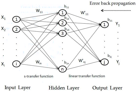 A standard BPNN is a multilayer feed-forward neural network with error backward propagation, including an input layer, one and more hidden layers, and an output layer. Each layer is composed of a number of neurons that are connected by weights and thresholds. To solve a complicated problem, a complex neural network structure must be established by increasing the number of neurons and layers, and the structure of the network should match the problem []. Figure 2 illustrates a three-layer BPNN with a sigmoid function for the hidden layer and a linear function for the output layer.