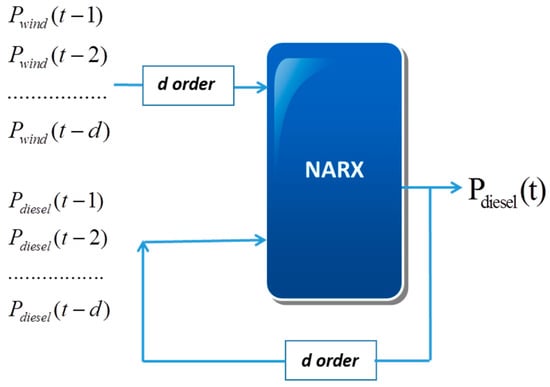 where d is the delay-order of independent variable; is wind power at t hour; is the output power of the diesel generation power in one-hour ahead scheduling. It should be noticed that, in the NARX model, load demand is not the independent variable because it has been contained in .