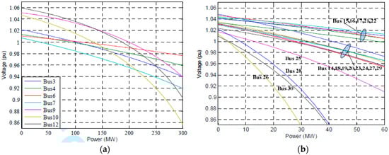 (a) Power–voltage (P-V) curves for generation areas of the IEEE 30 bus system; (b) P-V curve for loading areas of the Institute of Electrical and Electronic Engineers (IEEE) 30 bus system.