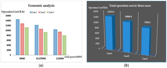 (a) Operation cost with consideration of wind distribution; (b) Total operation cost in three cases.