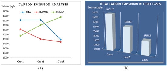 Table 3 presents the carbon emission parameters of diesel engines []. Figure 8 reveals the benefit from the renewable energy. It shows that total carbon emission decreased from 17,064 kg/h to 15,364 kg/h with increasing wind power in Case 1. Compared with Case 1, the greenhouse gas emissions dropped by 5.9% every hour, which is 15,194.4 kg/h in Case 3. The total carbon emission is markedly decreased from 16,151.27 kg/h to 15,194.4 kg/h owing to the optimal allocation of ESSs. It should be noted that the emissions are 17,386 kg/h in Case 3 when the wind power reaches the maximum. The simulation results indicated that the operating range of the diesel engine should be taken into account when optimizing the configuration of the ESS.