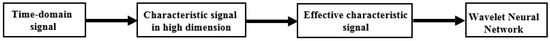 The wavelet neural network (WNN) is a forward network, which uses the wavelet basis function as the neuron activation function []. It adaptively adjusts the scaling and translation factors of the wavelet function, network connection weights, and the approximation function in batch mode. The fault diagnosis of the bearing based on the wavelet neural network is shown in Figure 3.