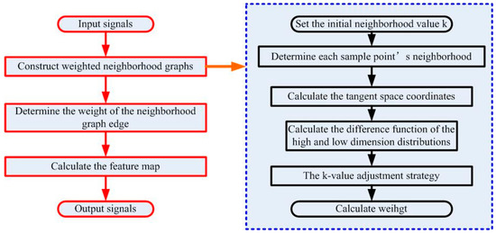 The idea of graph theory is introduced with the LE algorithm in this paper. By constructing weighted neighborhood graphs, the relation of the same positions of sample points in local neighborhoods is maintained in high and low dimensional space []. The neighborhoods k in LE is the key parameter in reducing dimensions. In view of the different characteristics of different manifold surfaces, it is easy to include the traditional fixed k value with the points in the same neighborhood graph. This results in the “short circuit phenomenon”, as these points do not belong to the same manifold area. To solve this problem, an improved Laplace Eigen-mapping method dimensionality reduction algorithm is proposed and is shown in Figure 2. Detailed step-by-step instructions are as follows: