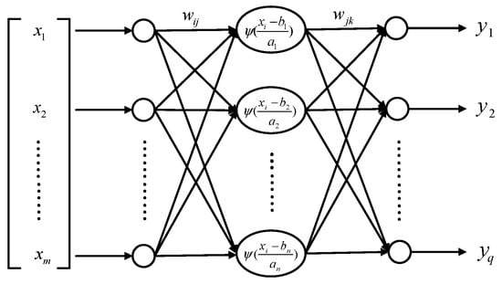 The above equation can be realized by a neural network with a hidden layer, and by adjusting the weights and to an approximate function. In the formula, is the wavelet basis function is the output of the network; and is the connection weight between the input layer/the hidden layer and between the hidden layer/the output layer.