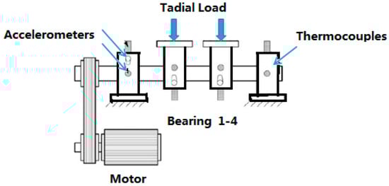 The bearing data was generated by the Industry/University Cooperative Research Centers Program (I/UCRC) for Intelligent Maintenance Systems. The test platform is shown in Figure 4. The rotation speed was kept constant at 2000 RPM by an alternating current motor and at a radial load of 6000 lbs. Data collection was facilitated by National Instruments Data Acquisition (NI DAQ) Card 6062E, with the sampling rate set at 20 kHz [].