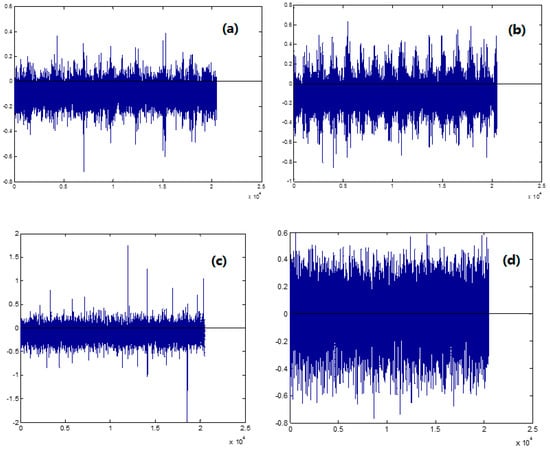 The test was carried out for 35 days. Figure 5a–d shows the vibration signals for the normal state, a roller element failure, inner race failure, and outer race failure, respectively [].
