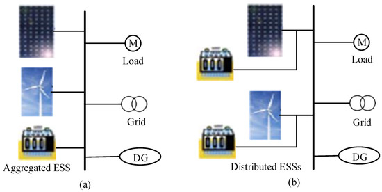 Illustration of energy storage system (ESS) configurations. (a) Aggregated ESS; (b) Distributed~ESS.