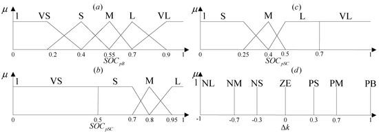 Membership function: (a) battery; (b) supercapacitor for ΔPWD ≥ 0; (c) supercapacitor for ΔPWD < 0; (d) fuzzy control output.
