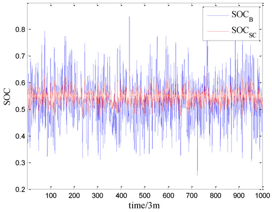 Investigation from Figure 6, it is clear that HESS dramatically reduces the fluctuation of wind power output, and 94% of |η| is less than 2%. However, for some period, the difference between the compensated wind power and the reference power is rather large. For example, when t = 437 s, PWDref = 66.25 MW: When t = 436 s, PWD is quite large, which leads the SC and the battery to charge and their SOCs to be high. As a result, HESS fails to well compensate the fluctuating wind power that produces a compensated wind power output of 70.63 MW.