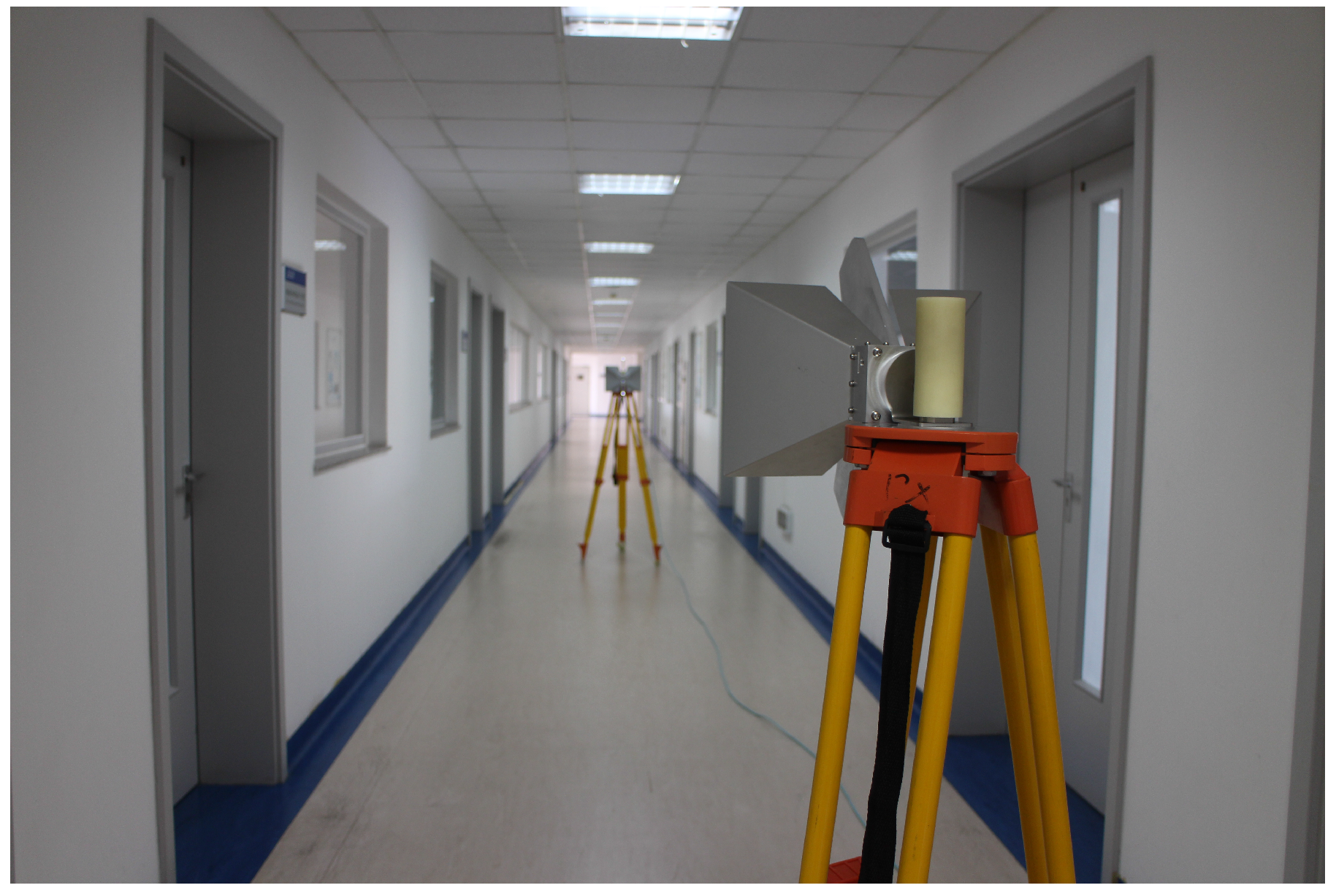 The measurements have been carried out in the second-floor corridor in the 18th building, National Institute of Metrology, Beijing, China. The building is constructed of concrete with faculty offices and laboratories as shown in Figure 2. The corridor is 20 m in length, 2.4 m in width and 2.8 m in height. The side walls, floor and ceiling of the corridor are constructed of concrete. The floor is covered with ceramic tiles and the ceiling is covered with polystyrene tiles. The corridor has a number of wooden doors and some windows. In the measurements, the doors and the windows were closed and no people were moving around.
