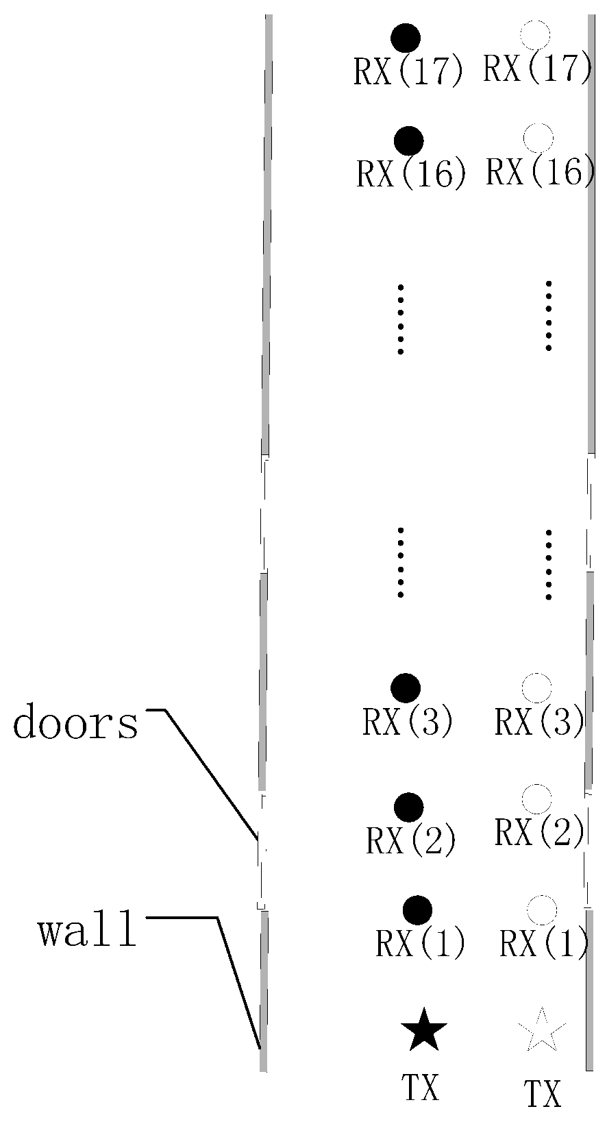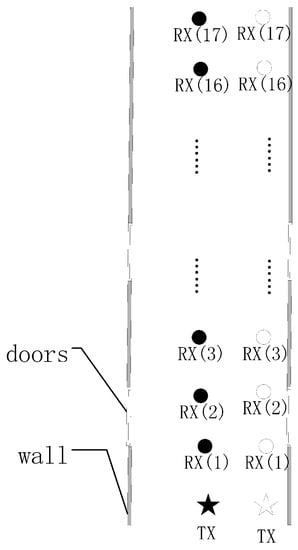 In order to analyze the influence of antenna location (whether near the walls) on channel characteristics, we conducted another measurement in the same scenario. All the measurement settings were the same as the previous measurements, but the TX and RX antennas were placed 0.5 m from the wall. As shown in Figure 3, the TX and RX are denoted by the hollow star and hollow circles, respectively.