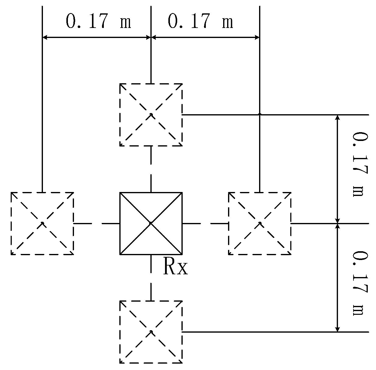 In order to achieve spatial averaging, five spatially separated positions were measured at each receiver location as suggested in [15]. One received position is at the center of one specific location, surrounded by the remaining four positions as shown in Figure 4 (top view); these positions are separated by about 0.17 m, which is about two wavelengths for 3.6 GHz and eight wavelengths for 14.6 GHz. Assuming that the phase of received signal is uniformly distributed, it is reasonable to average out the small-scale fading effect via these five positions [15] in the Ricean channel.