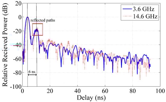 Table 2 indicates a minimal difference in the RMS delay spread for the two frequency bands. The statistical results are consistent with the above theoretical prediction. This phenomena has also been observed in the measurements of [26,27], where the RMS delay spreads from 2.4 GHz to 28 GHz are similar for the indoor LOS and non-LOS (NLOS) channels. However, some papers present different results. For example, in [10], for LOS, the RMS delay spread is around 8 and 4 ns for 2–10 and 57–66 GHz, respectively. The measurements were performed in a laboratory furnished with several closets, shelves, desk, and chairs. In this scenario, there are not only free space propagation and reflection but also the diffraction. The diffraction gain is frequency-dependent [24]. This may be the reason for the difference of the RMS delay spread in this scenario.