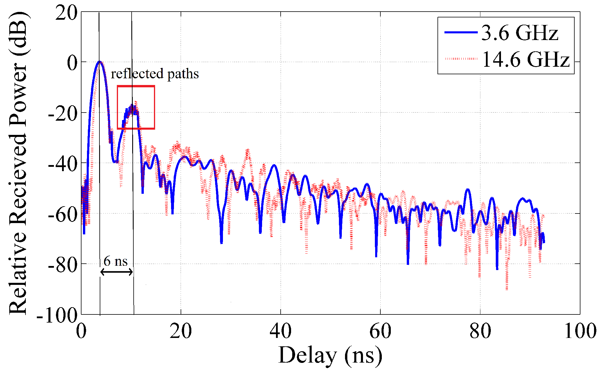 Figure 5 clearly illustrates multipath propagation. From basic trigonometry, the excess distances (compared with the LOS path) for the ground reflected path, the ceiling reflected path and the wall reflected paths are 1.85 m, 1.85 m, 1.43 m and 1.43 m, respectively. The distance differences divided by the velocity of light are from 4.77 and 6.16 ns. The components (area highlighted by red box in Figure 5) are likely the combination of all the four reflected paths since the relative excess delay is also between 4.77 and 6.16 ns.