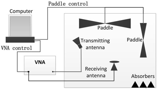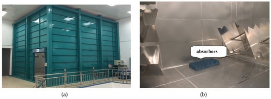 The RC is essentially an large, electric metal box, having dimensions of 5.09 m × 6.43 m × 5.57 m, as shown in Figure 8. In the RC, reflection is the main propagation mechanism [34]. Inside the chamber, the mechanical stirring was performed by two metal paddles that were moved stepwise. The measurement of RMS delay spread in the RC was repeated for 100 different fixed paddle positions spaced by . For the RMS delay spread estimation, the 100 measurement results were averaged to obtain the mean values. The RMS delay spread in the chamber can be changed by putting different numbers of RF-absorbing material inside the RC. We repeated the measurements for three and four absorbers, respectively. Each piece of the absorber is with 81 cones in a 9 × 9 array, the cone width is 6.8 cm, and the cone height is 17.8 cm. The transmitting antenna was directed into a corner of the chamber, and the receiving antenna was placed in the middle of the RC.
