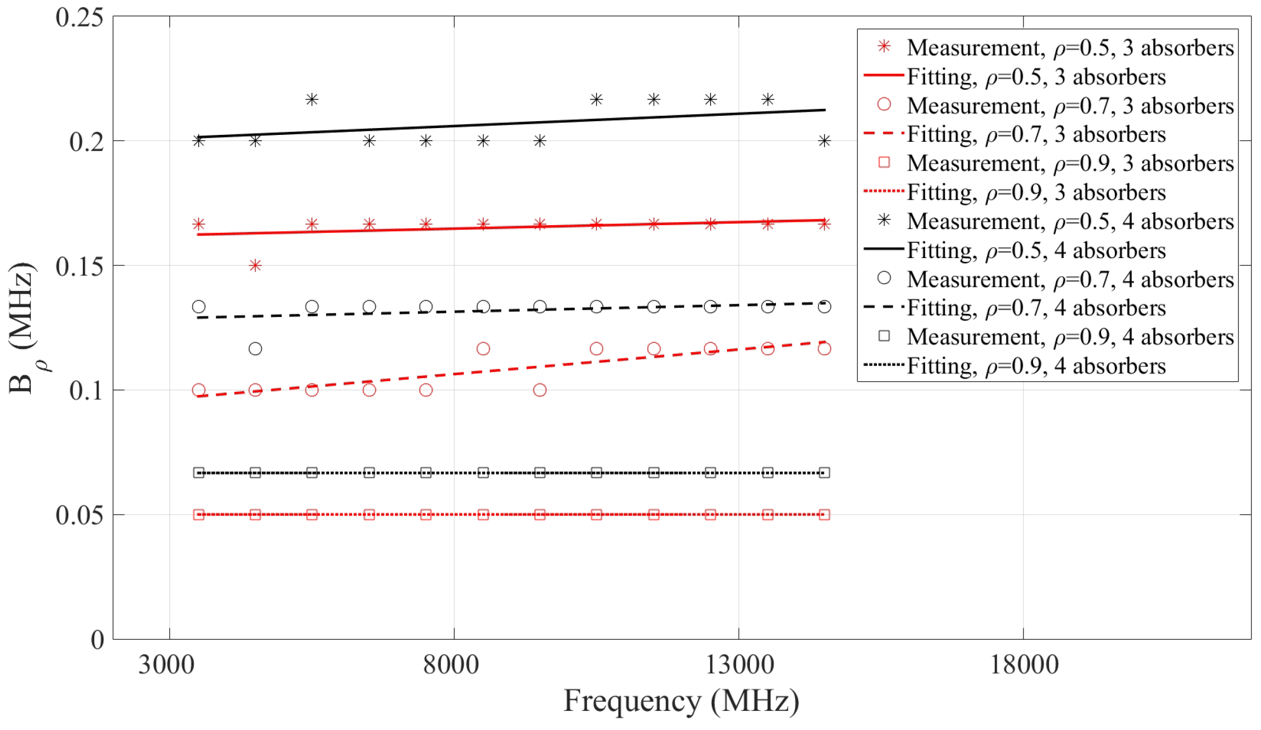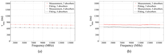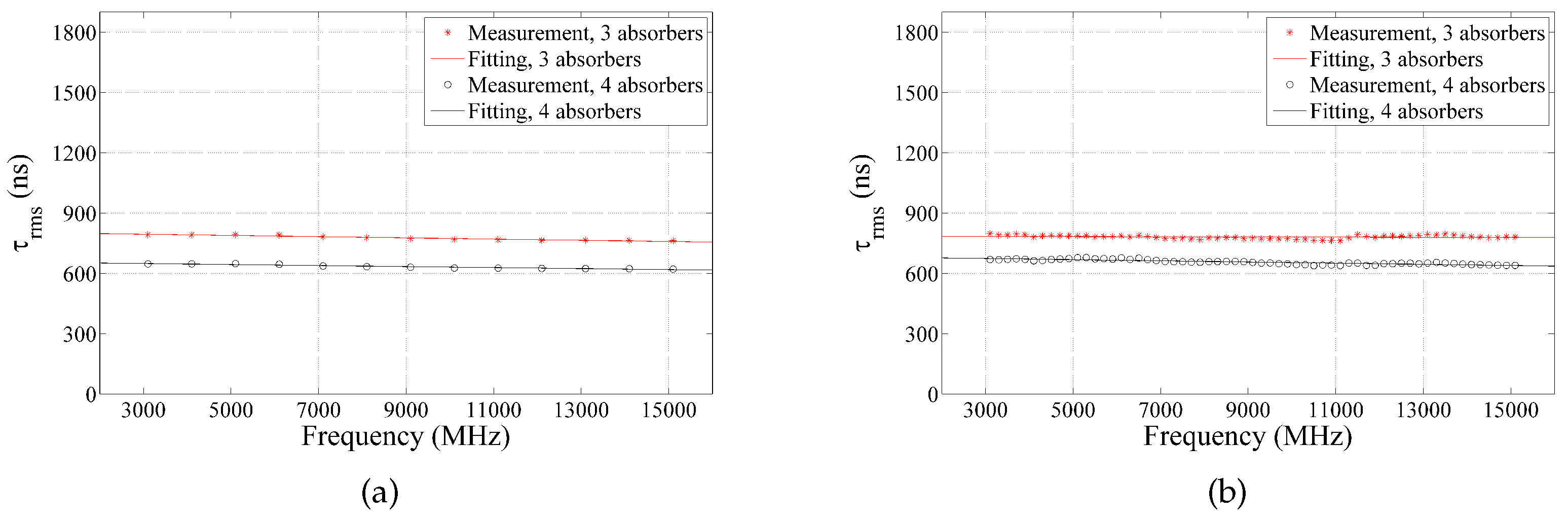 Figure 10a shows the measurement results and the linear fitting lines. The slopes of these fitting lines are −0.0020 ns/MHz and −0.0026 ns/MHz for the 3 and 4 absorbers, respectively. It is confirmed that the difference is minimal in the RMS delay spread for the whole sweep frequency range. In order to analyze the behavior of the RMS delay spread for a given frequency band with higher frequency resolution, we use a 200 MHz bandpass filter in postprocessing. This filter is applied to the measured frequency-domain data, and the RMS delay spread is calculated for different filter center frequencies. As shown in Figure 10b, the slopes of the fitting lines are −0.0023 ns/MHz and −0.0032 ns/MHz for the 3 and 4 absorbers, respectively.