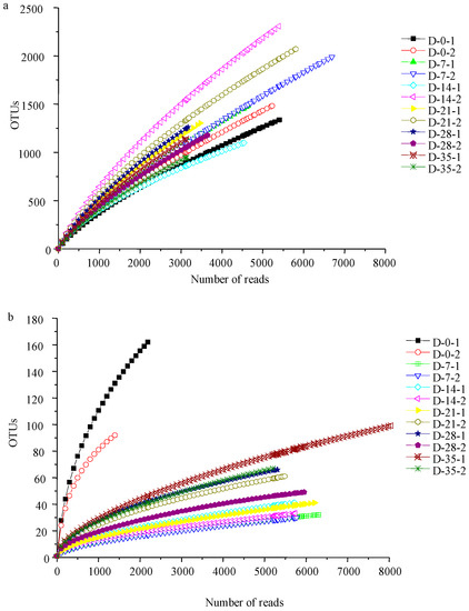 Rarefaction curve analyses of the 16S rRNA gene (a) and 18S rRNA gene (b) of the bacterial and fungal communities, respectively, present in the SSF of PFPT. Operational taxonomic units (OTUs) are defined as sequences sharing 97% nucleotide sequence similarity.
