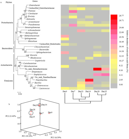 Heat map of relative abundances of major bacterial genera (>1%) (a); principal component analysis (PCA) analysis of bacterial communities in fermented tea leaves during the SSF of PFPT based on the relative abundances of the sample reads at the genus level (b).