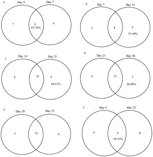 Comparisons of major bacteria (>1%) at the genus level between day 0 and 7 (a); day 7 and 14 (b); day 14 and 21 (c); day 21 and 28 (d); day 28 and 35 (e); and day 0 and 35 (f) during the SSF of PFPT.