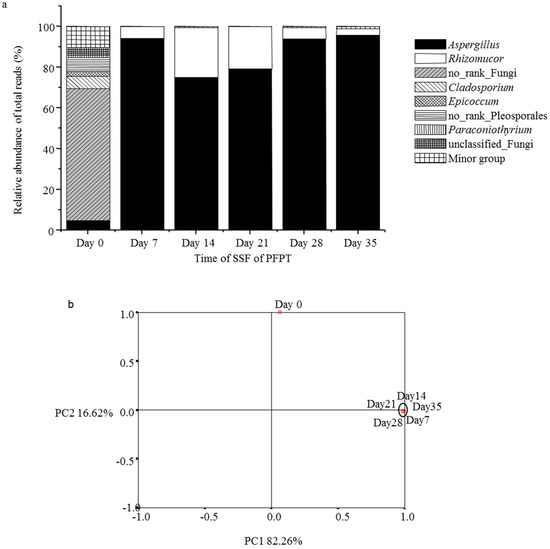 Fungal communities in tea leaves at the genus level during the SSF of PFPT (a); PCA analysis of fungal communities in fermented tea leaves during the SSF of PFPT based on the relative abundances of the sample reads at the genus level (b). Minor groups are composed of the parties showing a percentage of reads <1.0% of the total reads in each sample.