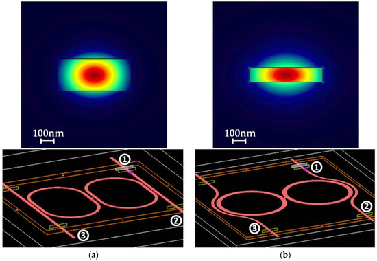 Analysis immediately identified that standard (500 × 220 nm, width × height) Si-waveguides could not achieve the required bus-ring coupling coefficient, while maintaining a waveguide-to-waveguide gap > 200 nm. However, by taking advantage of the fact that the TE optical mode propagating in height-reduced waveguides more deeply extends outside of the Si-core (see the top part of Figure 1), it is possible to increase the waveguide coupling coefficients. This creates the possibility of two different solutions, which were investigated separately—(i) the use of race-track resonators with standard waveguide; and (ii) the use of reduced-height waveguides with a curved coupling region.