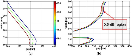 The results of this analysis, shown in Figure 2, highlight that the tolerances offered by different designs can be very different. The plots allow the parameters of the most tolerant design to be identified, for designs with widths in the range of 800–850 nm (i.e., 6% tolerance), and gaps in the range of 400–420 nm (i.e., 5% tolerance). These can still deliver the required coupling coefficient, with a deviation of just ± 0.5 dB. It is worth noticing that, once the waveguide width was selected, the inter-resonator gap can be immediately derived by numerical simulations, because it is the only parameter that can be tuned to achieve the desired kR (see Table 2).
