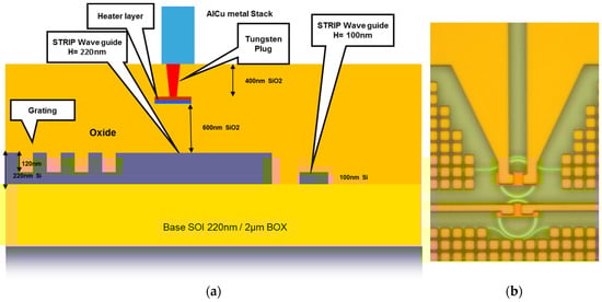 A HDP (high density plasma) oxide cladding layer encapsulates the waveguide, and optically insulates the waveguide from the Ti/TiN heater, used to tune the filters. The oxide layer thickness is selected to give the best trade-off between heating efficiency and optical losses. The heater consists of a 10nm-thick layer of Ti (used for adhesion), and of a 110 nm-thick TiN resistive layer, that is patterned to create the thermo-optic phase shifter above the waveguide. Finally, a silicon-oxide cladding layer is deposited, and a tungsten via is added, to make contact with the heater layer. This oxide layer provides optical isolations from the aluminum metallization, used for electrical routing to the contact pads. A schematic cross-section of the full device is shown in Figure 3a, with a top-view microscope image of the racetrack-based structure in Figure 3b.