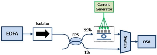The experimental set-up used to characterize the filters is shown in Figure 4. The optical input is the broadband ASE (amplified spontaneous emission) from an Erbium-doped fiber amplifier (EDFA). The ASE is first sent to an optical isolator, and then to a 1:99 fiber power splitter—1% of the light is used as a reference to monitor the ASE output, while the remaining 99% is sent to the DUT (device-under-test). 1D-grating couplers are used to couple the light from the ASE fiber-source to/from the Si-PIC with the integrated filters. The output signal from the DUT, together with the 1% monitor signal, are monitored by an optical spectrum analyzer (OSA), using a MEMS-activated optical switch to acquire both spectra. Using stabilized current generators, the resonance wavelengths of the individual rings in the filters can be precisely thermally-tuned.