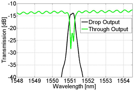 The results collected from the second iteration devices are shown in Table 5; measurements were carried out on replicas of the same optimized filter structures, fabricated on different chips, and the minimum and maximum values obtained at the central resonance (the one closest to 1550 nm) are reported. The experimental results obtained using the newly-designed filter, showed some significant differences and improvements with respect to those of the first iteration in Table 3. In particular, a significant reduction of the insertion loss was observed for the ring-based filter, thanks to the increased radius. An example of the OSA-acquired spectra of the drop and through outputs, for the best performing ring filter, is shown in Figure 5. The performance of the racetrack-based device slightly deteriorated, because of the higher round-trip losses, introduced by the short-radius curves, and because of the change in the modal index between the curved and the straight sections. The variation in the measured absolute resonance wavelength for nominally identical filters, was found to be <0.4 nm for structures fabricated on the same chip, and <4 nm for structures with the same design across different chips.