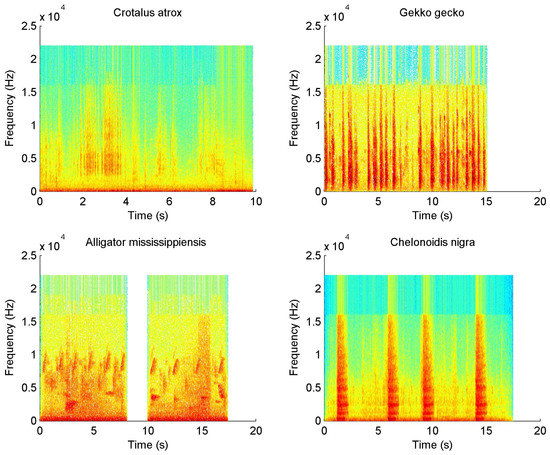 Figure 2 shows four spectrograms belonging to several kinds of reptiles: Crotalus atrox (Diamondback rattlesnake), Gecko, Alligator mississippiensis (American alligator), and Chelonoides nigra (Galapagos giant tortoise). The alligator spectrogram presents a complex and most rich vocalization similar to birds, while the other species present a simpler sound production of hissing and groan calls.