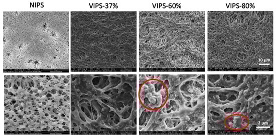 Figure 1. Top surface scanning electron microscope (SEM) images of membranes prepared using NIPS (non-solvent-induced phase separation) and VIPS (vapor-induced phase separation) processes with 12% w/w PVDF (Polyvinylidene fluoride) concentration and cast thickness of 500 µm (10 µm and 2 µm scale bares for all top and bottom row SEM images, respectively).