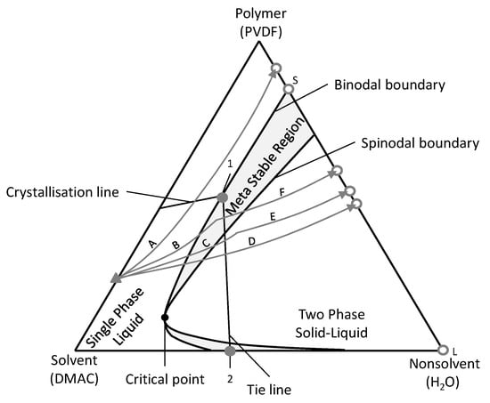 Figure 2. A three-component phase diagram for the polymer, solvent and non-solvent system generally depicting the VIPS and NIPS processes. Path A and D represent delayed (VIPS) and spontaneous (NIPS) de-mixing, respectively. Paths B and C represent an initial VIPS process followed by a NIPS. is initial polymer solution composition and is composition of final membrane. DMAC: dimethylacetamide.