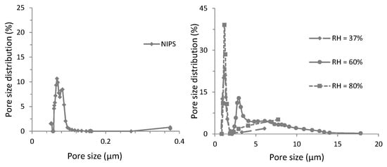 Figure 3. Pore size distributions (PSD) of membranes made via the NIPS (left) and VIPS (right) processes. Casting thickness: 500 μm, polymer solution: 12% w/w PVDF.