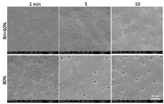As the RH and exposure time increased, the presence of droplet-like pore mouths on the membrane surface increased (see SEM images of 80% at 10 min, Figure 5), which led to the creation of larger pores, especially at higher RH. These observations are in agreement with BP and MPS results, both of which increased with an increase in RH (Table 4). It is worth noting that some large pores on the membrane surface were a result of localized water vapor condensation on the top of the polymer film that was unavoidable sometimes during RH tests. Whenever the ambient humidity was below the RH set-point, the humidifier created extra water vapor that could potentially precipitate on the top of polymer film, leading to local concentration of water.